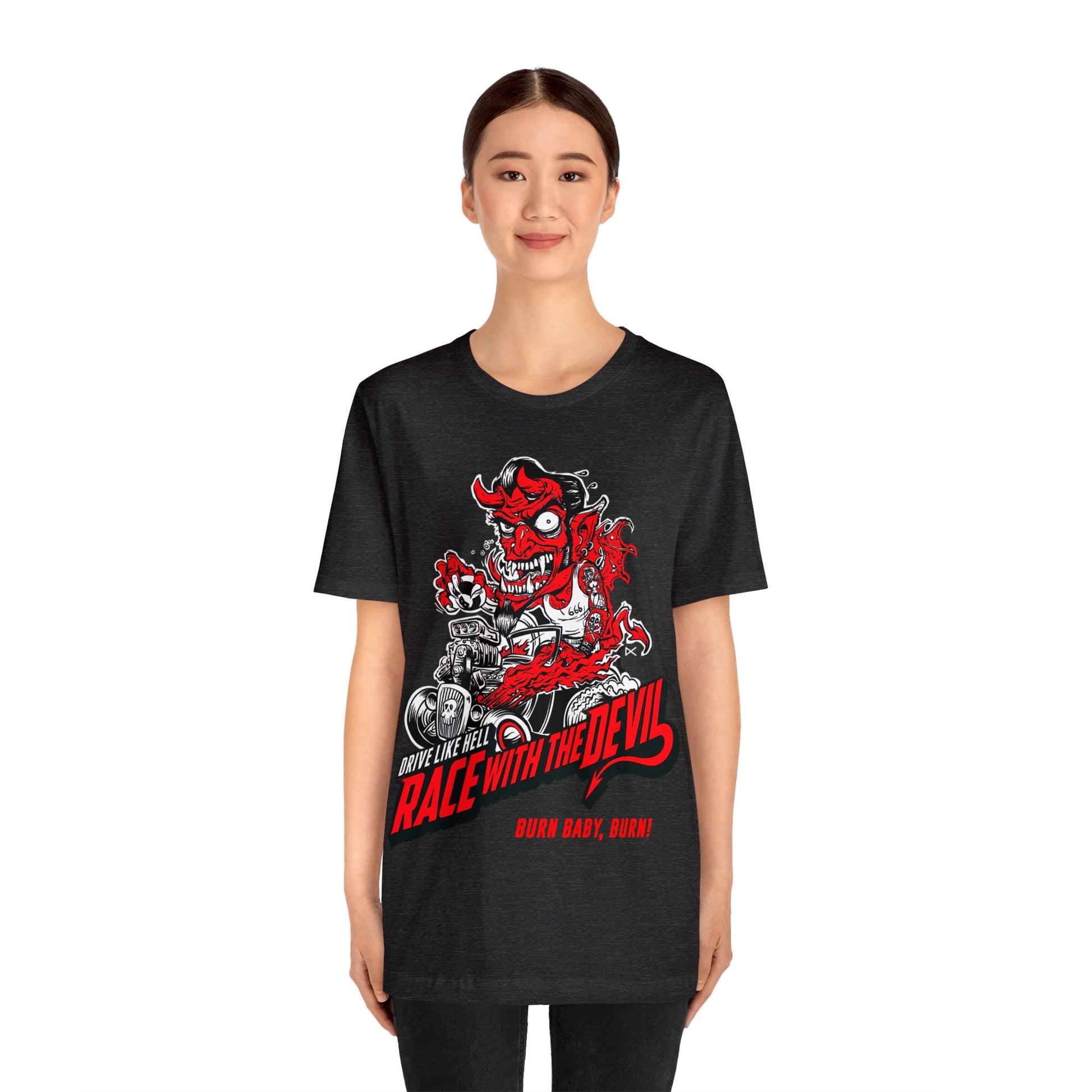 Race With The Devil Burn Baby, Burn Unisex Jersey Short Sleeve Tee.